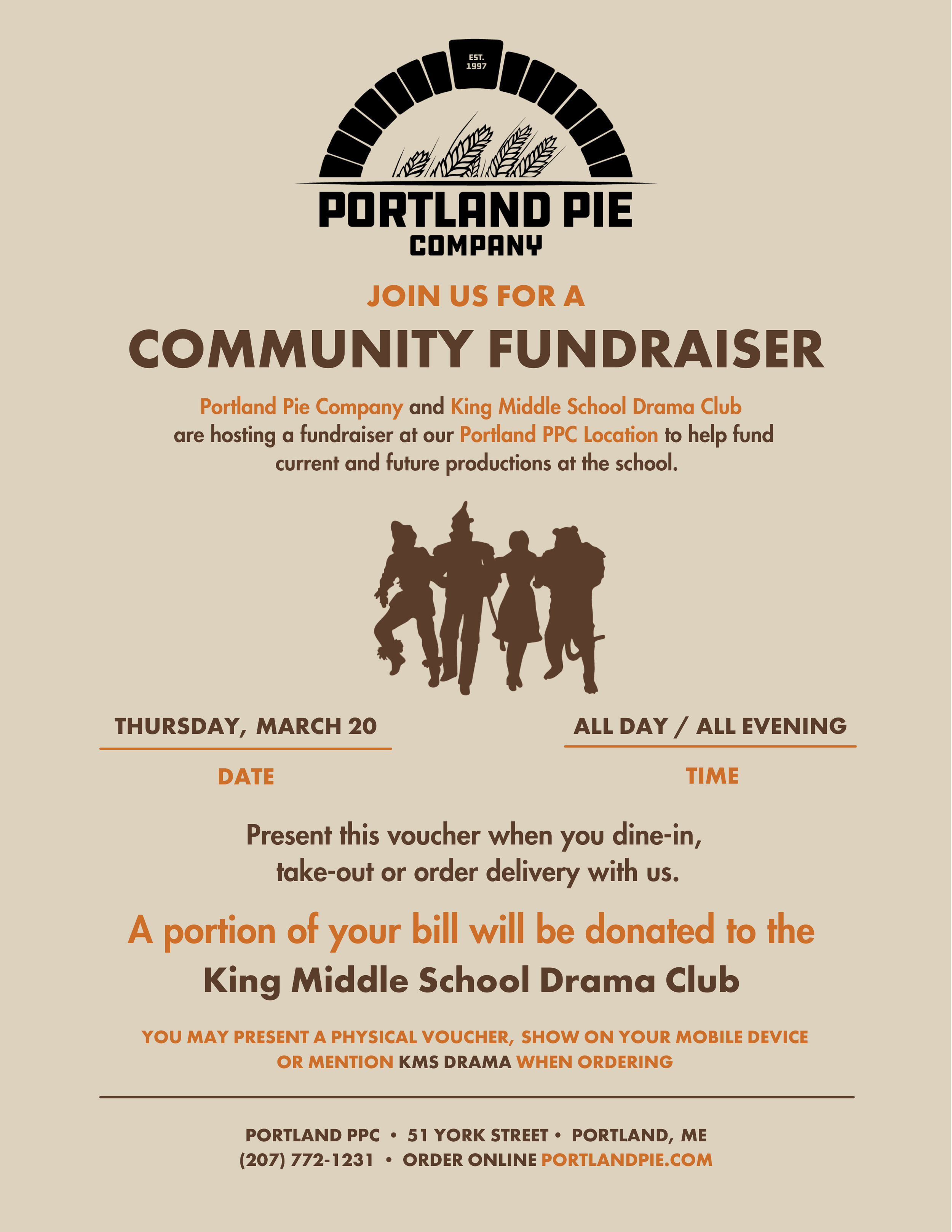 Flyer for a community fundraiser hosted by Portland Pie Company and King Middle School Drama Club, featuring a silhouette of children, event details, and contact information.